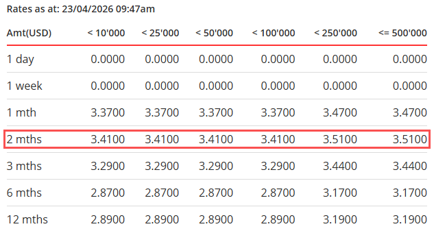 新加坡最大银行——星展银行提供多币种外币定期储蓄,美元定期储蓄的利率比上个月大降0.07%,存两个月最高3.51%!(但需存至少25万美元)