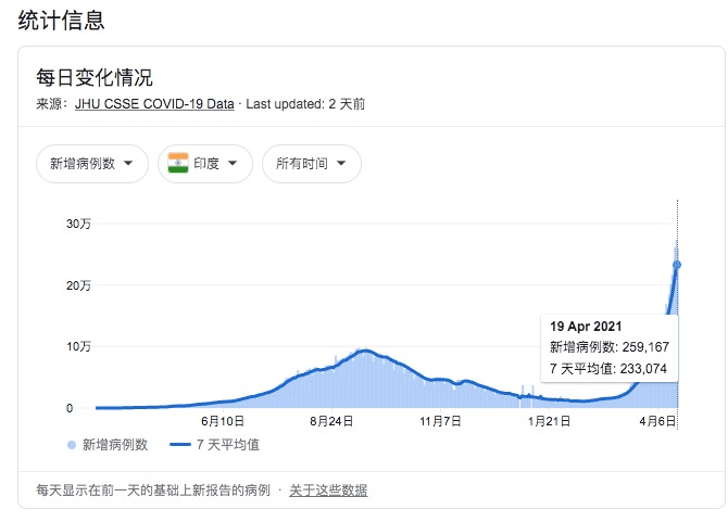 在过去7天,印度平均每日的新增新冠患者数量已经达到23.3万人。