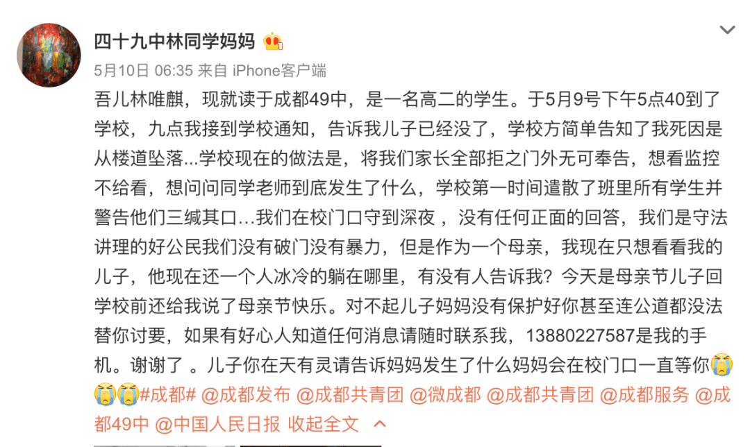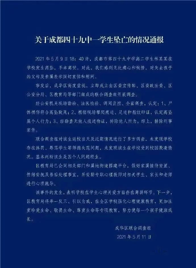 5月9日18点四十分左右,程都四十九中林同学在学校内坠亡。5月11日,成都市成华区教育局发布通报,初步说明该学生是因为个人问题而轻生。