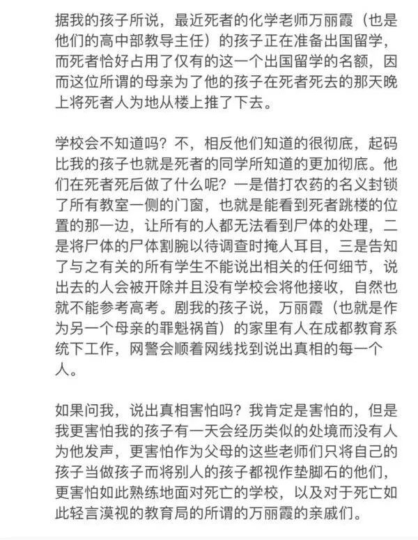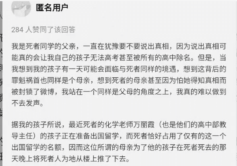 更是有匿名网友说,自己为死者同学的家长,这起学生坠亡案的背后有内情。
