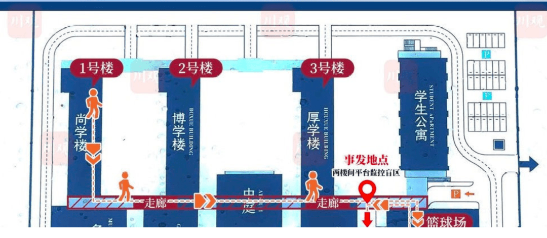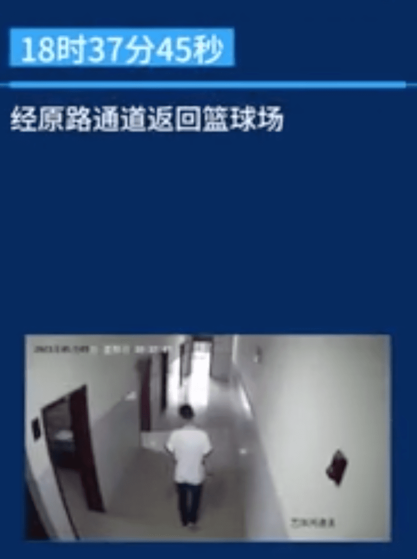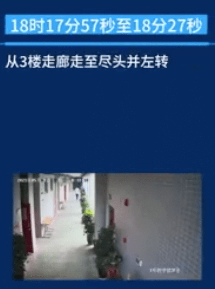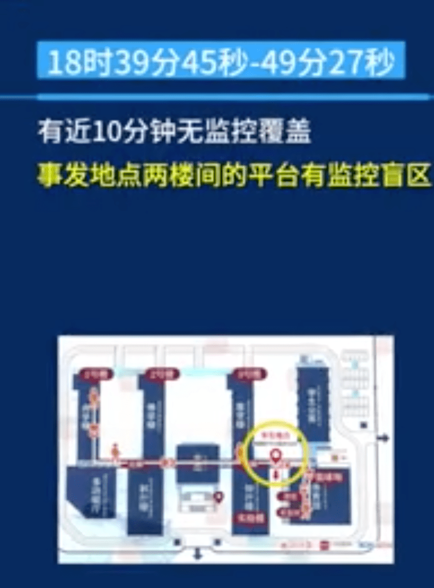 在事发地两楼间的平台有监控盲区,所以随后在18点39分45秒到18点49分27秒,有大约十分钟无监控覆盖。