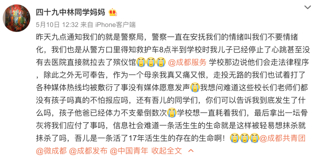 这个案件中坠亡学生的家长为自己孩子生命的逝去感到心痛,在微博上痛苦地要求知道自己儿子死亡的真相,要为自己的儿子讨回一个公道。