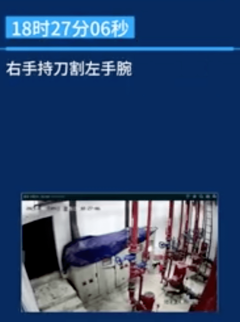 在水泵房,林同学第一次尝试了自杀,他把手表由左手换到右手,并右手持刀切割自己的左手腕。