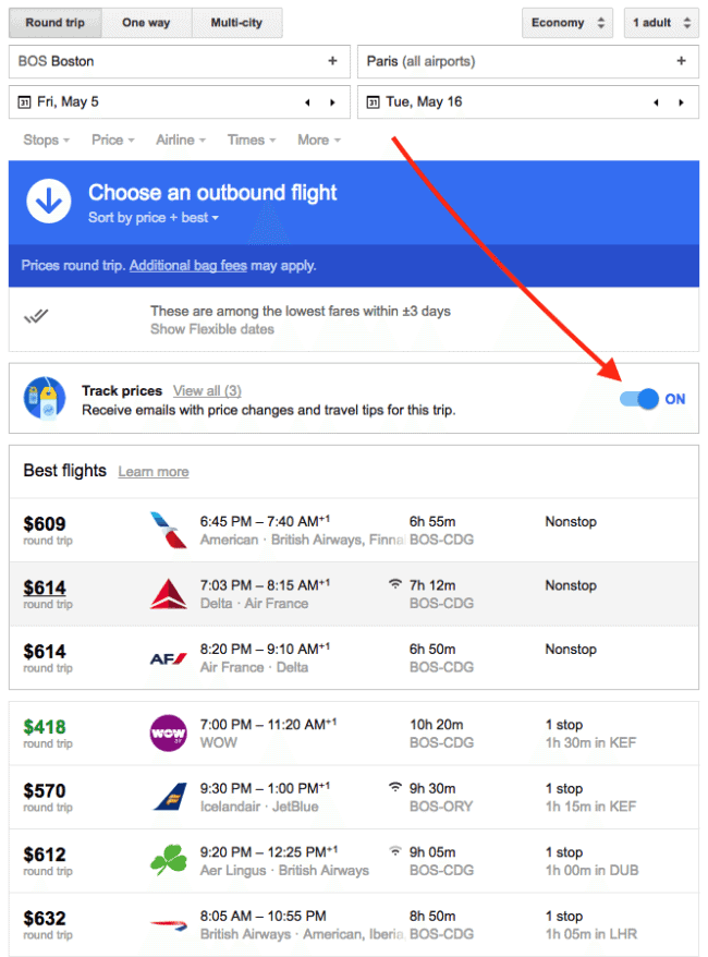 搜索栏下方有一个小的切换开关,可以让你追踪所需路线的价格。只要打开它,当票价变动时,谷歌会给你发送电子邮件。你无需不断监控各家航空公司的优惠,或设置何时预订的提醒。