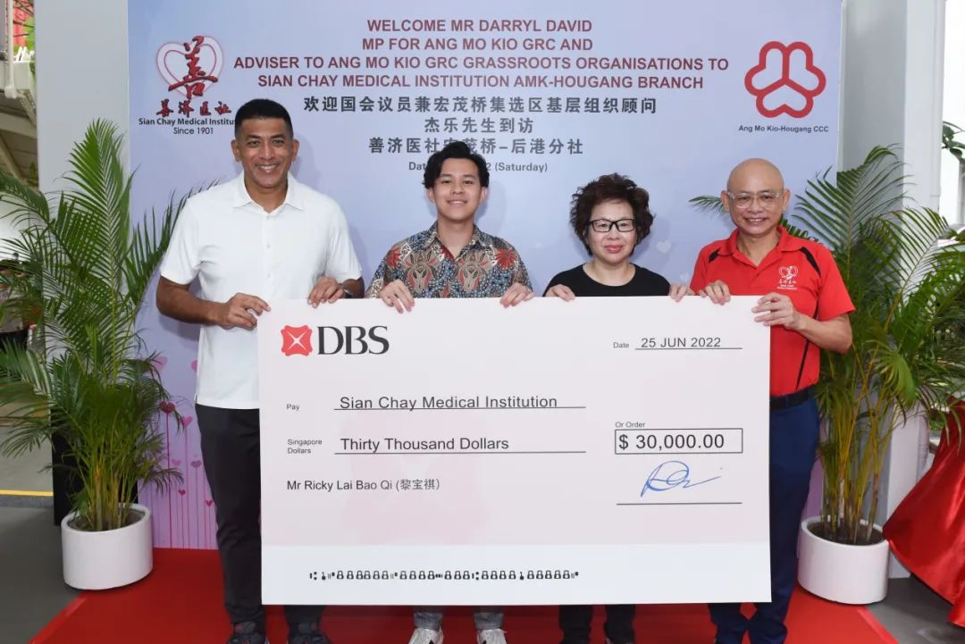 除了分送爱心礼包,杰乐先生还见证善济医社荣誉主席,K2 F&B Holdings Ltd ( 新加坡富城饮食集团)总裁朱志强PBM,廖宝云夫妇捐赠$50万,及善心人士黎宝祺先生捐赠$3万,支持善济拓展慈善事业的支票移交仪式。