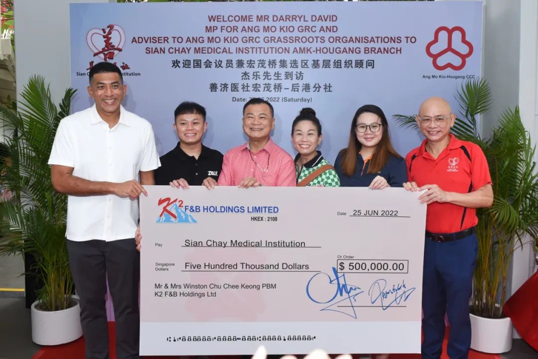 善济医社荣誉主席,K2 F&B Holdings Ltd (新加坡富城饮食集团)总裁朱志强PBM、执行董事廖宝云女士、朱佩诗小姐和朱博聪先生在主宾杰乐议员的见证下将50万元善款移交予善济医社义务执行主席卓顺发太平绅士