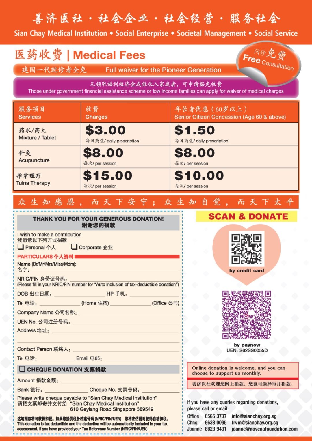 善济医社十分感恩建国一代和立国一代人士 对国家的贡献与付出,凡建国一代,在善济医社总社及各个分社就诊,全部免费。立国一代人士在此也可以享受到领药一天1.5元,其他项目优惠的待遇。凡领取福利救济金或低收入家庭者,可到善济各分社申请豁免收费。