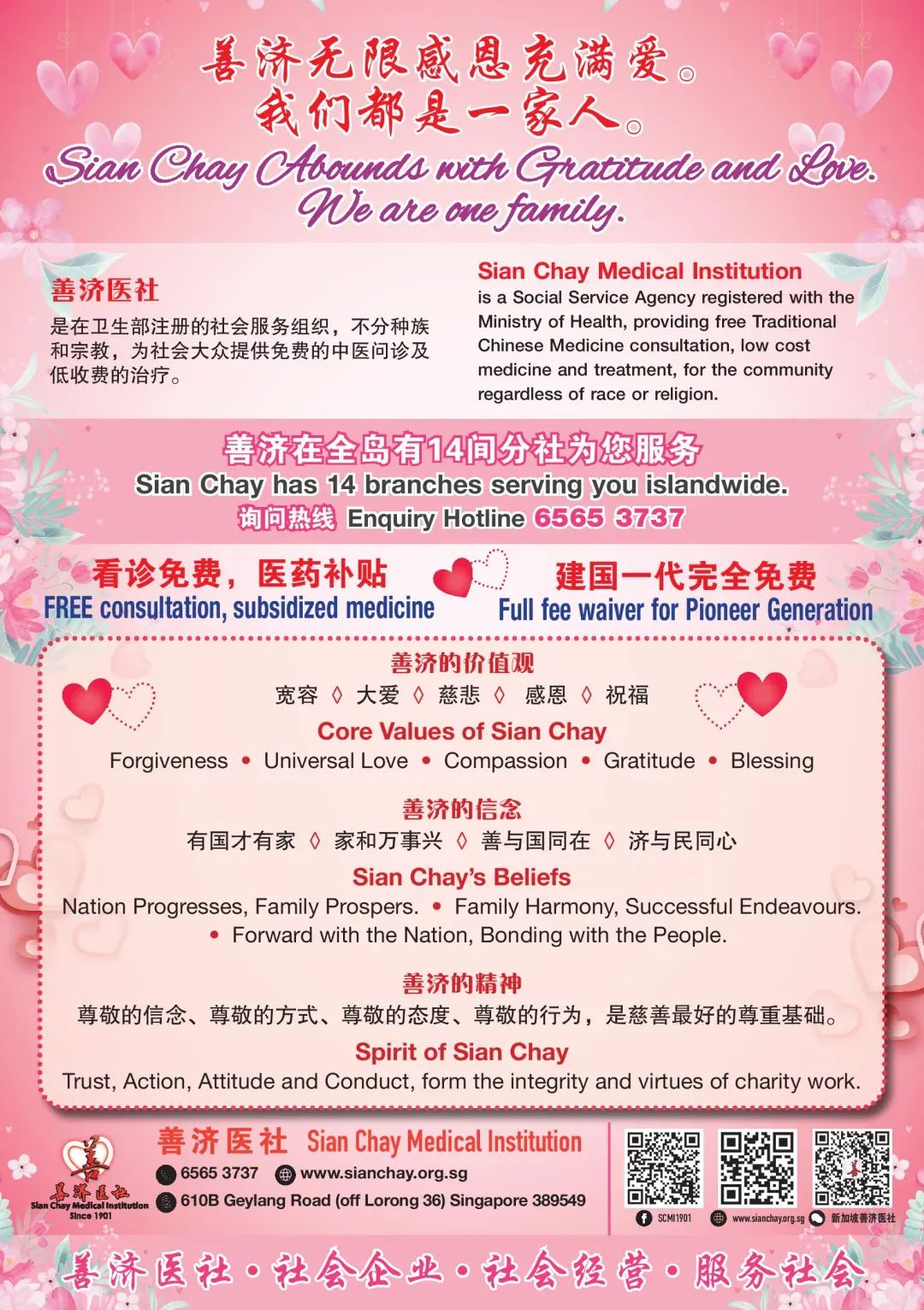 慈善事业,大爱同理,光明同行,共襄善举。欢迎居民们前来医社看诊及保健养生。希望您也将此信息分享给身边的亲朋好友及社会大众,善济医社将竭尽全力去服务他们,让光明与善爱温暖他们!