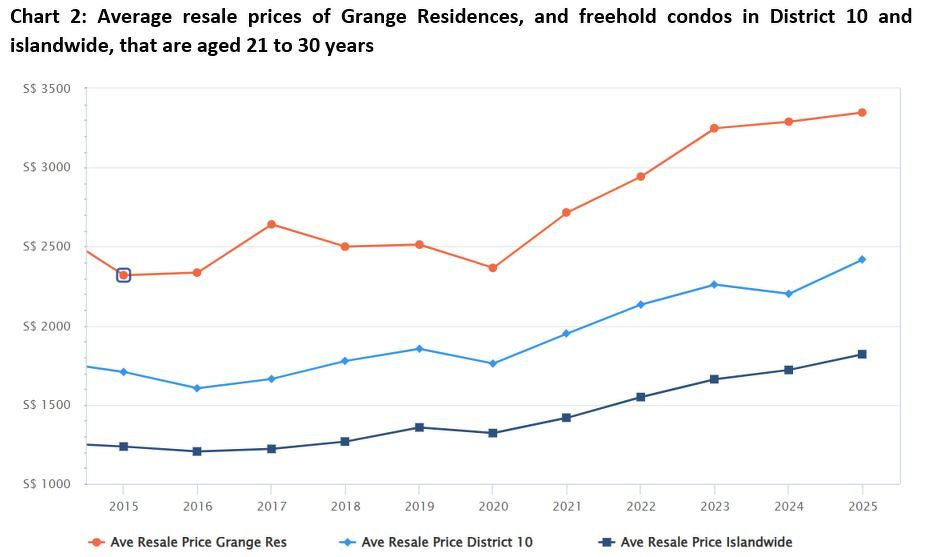 格兰居在2002年推出时的平均价格为每平方英尺1349新元。自那时起,其价格已飙升至每平方英尺3348新元,高于该标的单位3174新元每平方英尺的交易价格