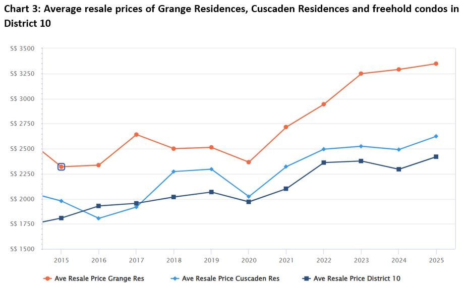 格兰居的平均转售价格(每平方英尺3348新元)趋势高于卡斯加登居Cuscaden Residences(每平方英尺2624新元)和第10区的永久地契共管公寓(每平方英尺2420新元)。