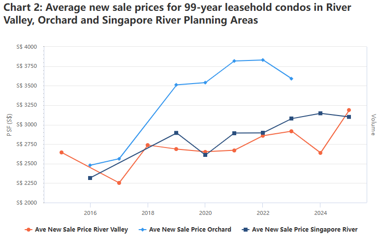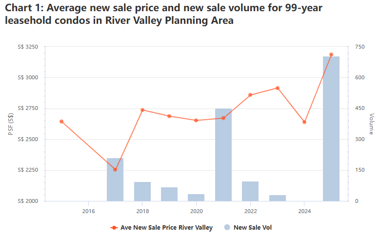一个事实是:River Valley的新公寓价格已经上涨了很多。从2020年到2025年,99年地契公寓的平均新售价格上涨了20.2%,达到每平方英尺3188新元。另外,公寓交易量也在增加,从2020年的35套增至去年的705套。