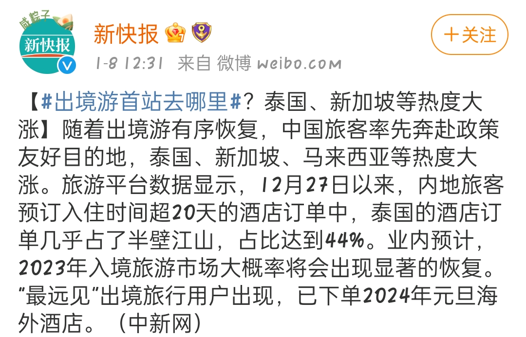 据中新网报道,甚至已经有中国人将行程排到了2024年元旦,提前一年为出国游做准备!