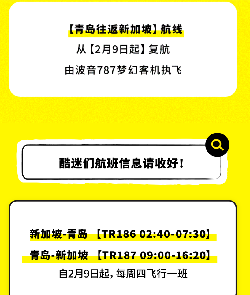 再加上,新加坡与中国之间的直飞航班一直不断恢复中......昨天,酷航官宣将在2月初重启新加坡-青岛的航班。