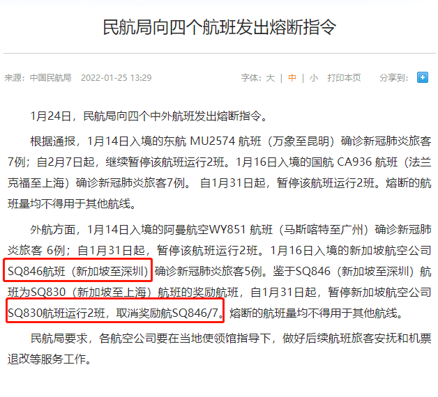 所以自1月31日起,暂停新加坡航空公司 SQ830航班运行2班,取消奖励航SQ846/7,并且熔断的航班量均不得用于其他航线。