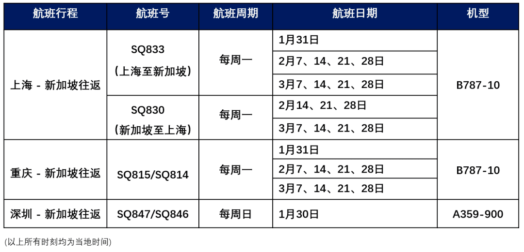 2. 取消2022年1月31日及2月7日SQ830航班(新加坡至上海)。SQ833航班(上海至新加坡)不受影响,将正常运营。