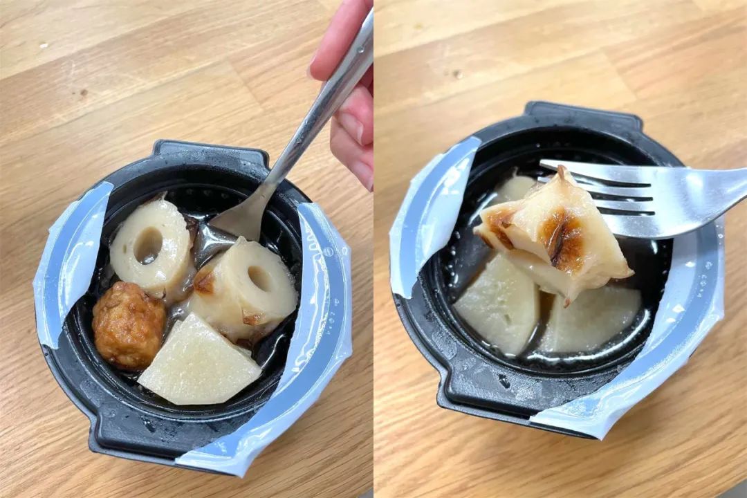 不过是一盒一盒包装好的,不是摆在外面可以自选的那种。售价为$2.8/盒,里面有肉丸,鱼卷,白萝卜,浸在关东煮汤汁里。
