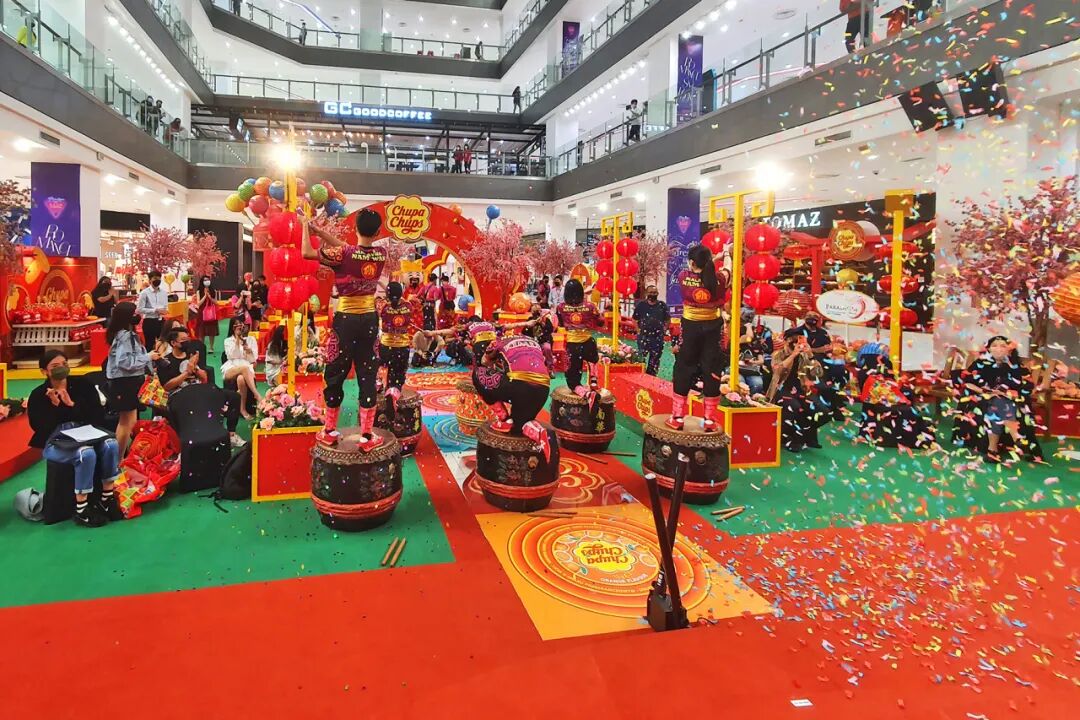 AEON Mall Tebrau City 新春路演有舞狮、财神等表演,设摊售年货礼篮、小吃与装饰。