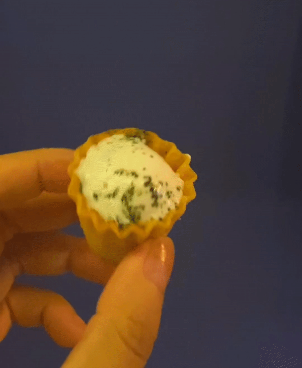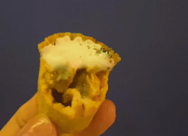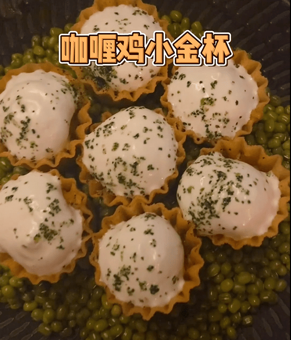 外表的油炸云吞皮,赋予了小金杯酥脆的口感,丰富清香的内馅下,则是嫩嫩的咖喱鸡。