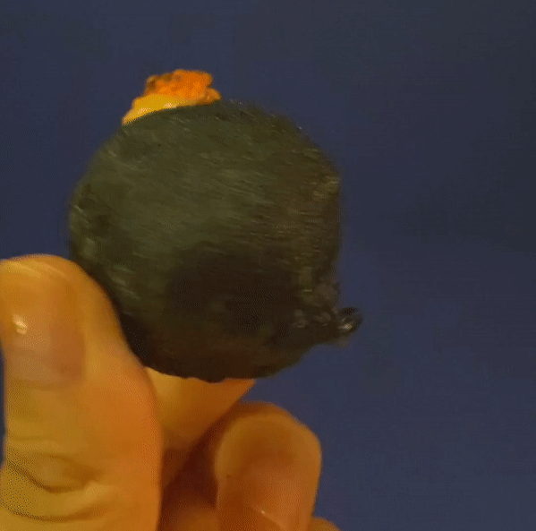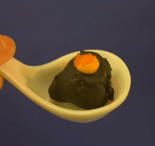 食物的外面一层为黑色软酥皮,中层为新鲜的荔枝果肉,内里为虾肉馅儿内心,层次感分明。用火蒸过的虾明亮透出的外观,令人叹为观止。