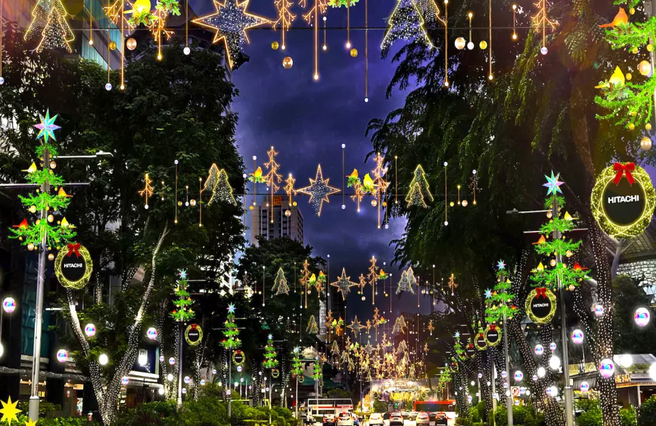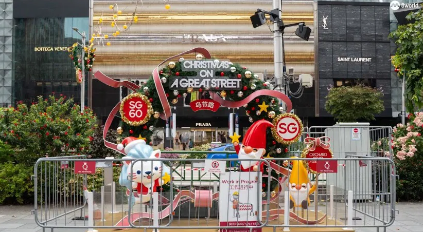 2025 年 11 月 8 日起,乌节路 3.1 公里路段将开启亮灯活动,圣诞装饰融入 SG60 标志与 Merli,以金、玫瑰金、银白色为主调,传递温暖欢乐,彰显公共精神与联结感。