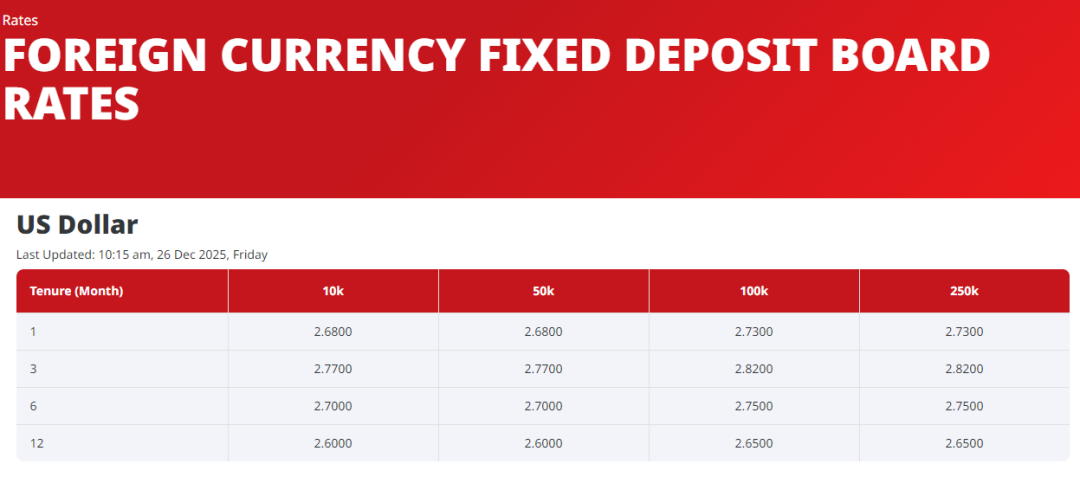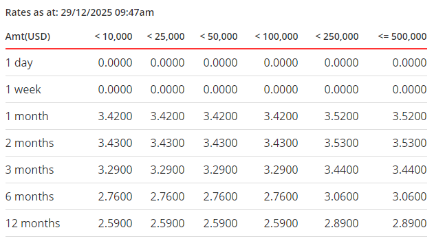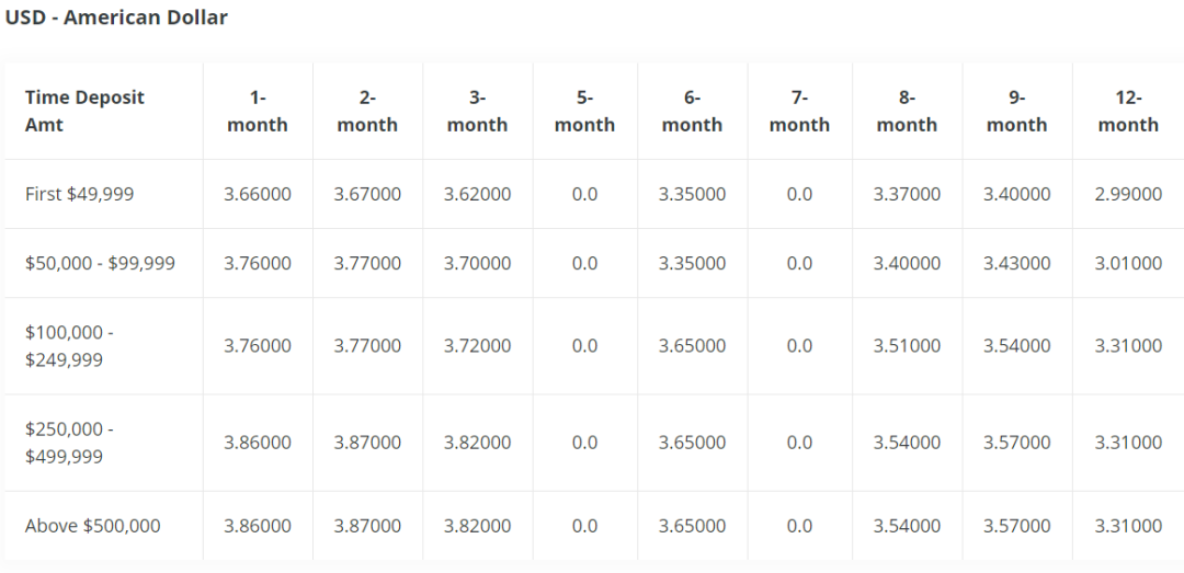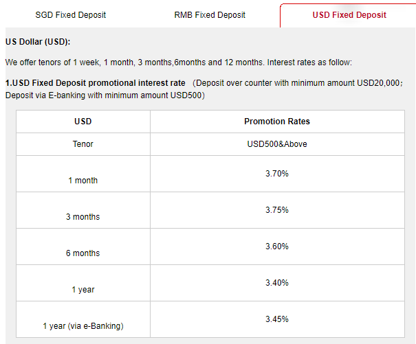 大华银行目前最佳美元定存利率为1个月或的3.40%。同样也需要存至少25万美元才有。