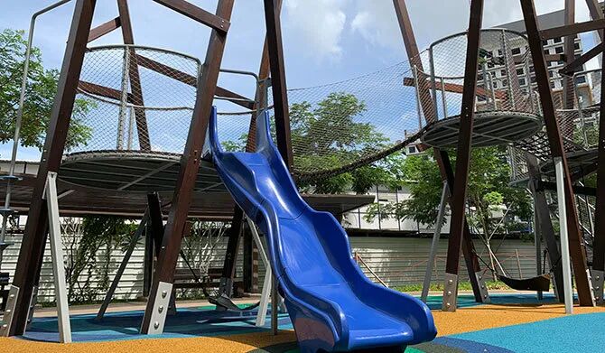 想让孩子兼顾玩乐与晒太阳补维生素 D?Hub & Spoke 设有游乐场,孩子们可在这儿尽情攀爬、探索多层游乐设施,享受欢乐时光。