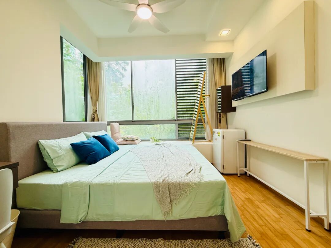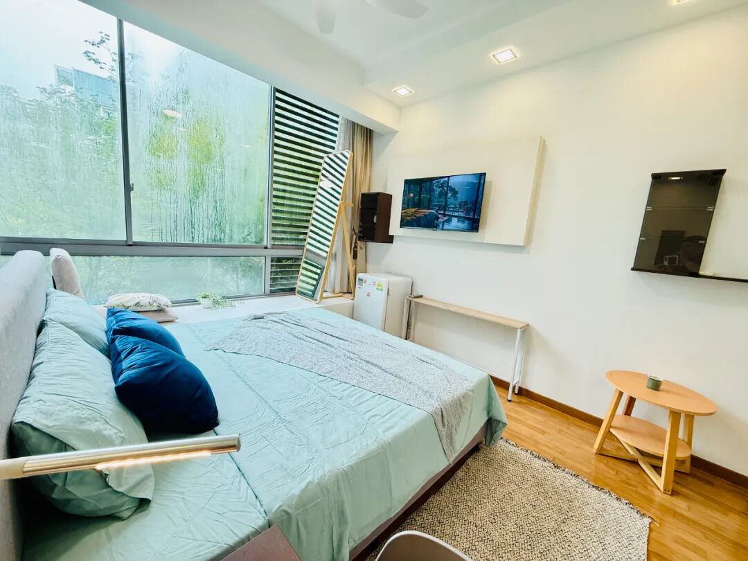 房间通透安静,绿意窗景伴鸟鸣,公寓设施齐全:泳池、健身房、BBQ、网球场,定期保洁免打扰。