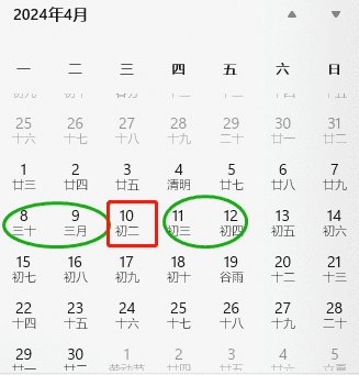 ④4月可请4月8日-9(周一二)、11-12日(周四五)