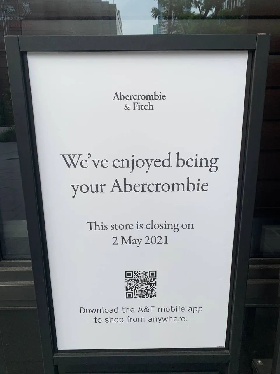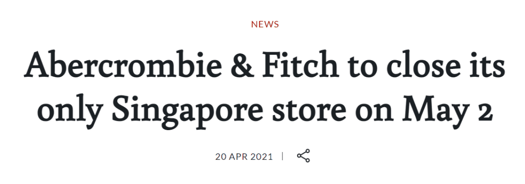 美国休闲服饰品牌Abercrombie & Fitch周一(4月19日)发声明,将于5月2日关闭其新加坡实体店。