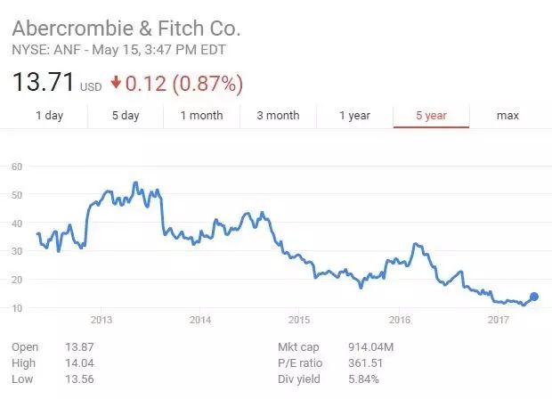 其实早在2017年,美国A&F就传出财报一路下滑,面临关店的厄运~