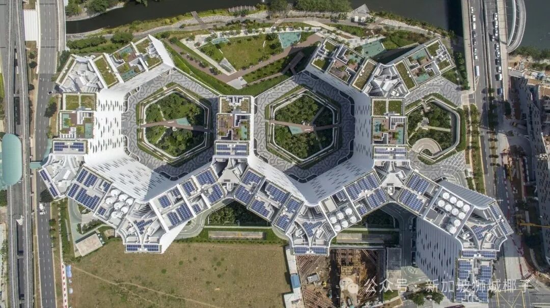 园区屋顶装太阳能板供电,还将厨余变肥料、雨水经净化灌溉绿地,尽显狮城绿色发展理念。