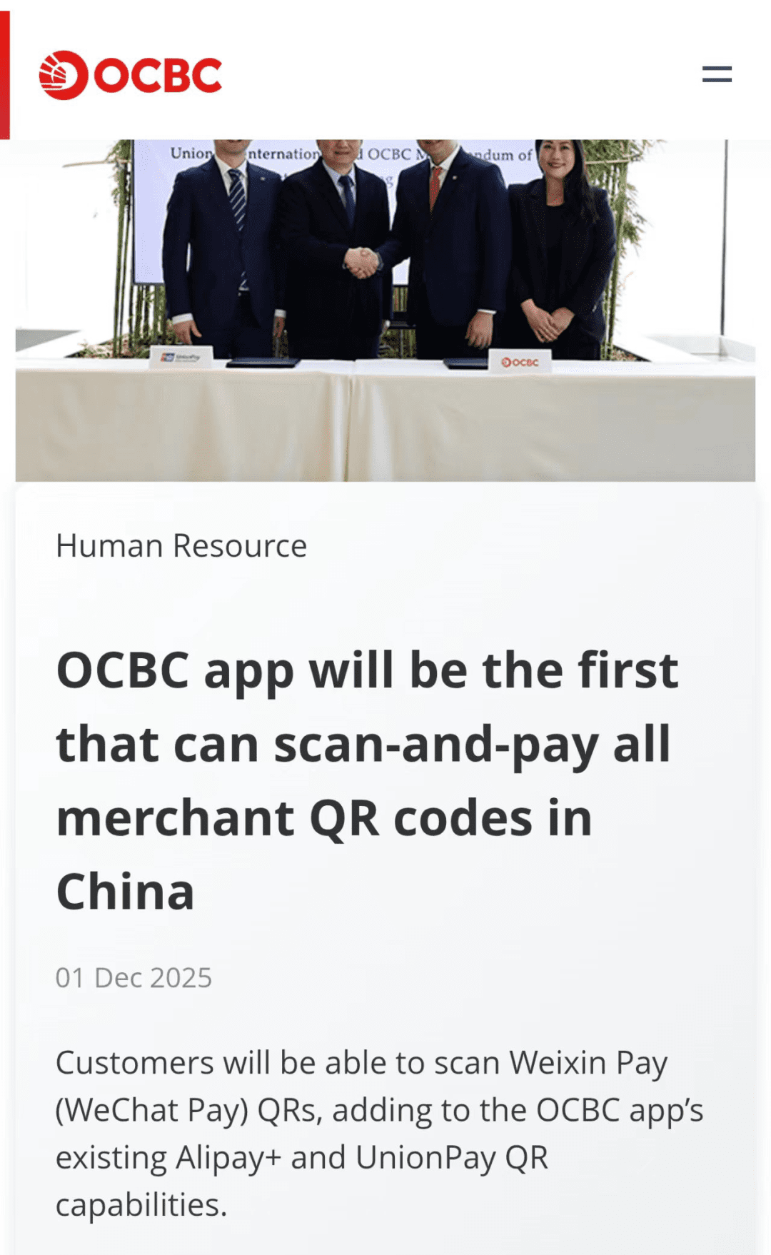 华侨银行此次打通微信支付,让新加坡旅客在中国支付体验大幅提升。2026年功能上线后,只需一个OCBC应用,即可畅行中国扫码场景,真正实现 “旅行支付无国界”。