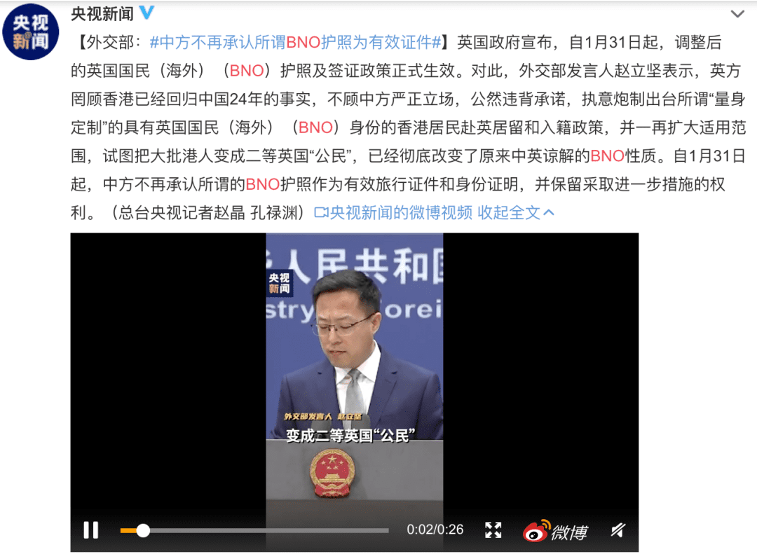 外交部发言人赵立坚表示,英方罔顾香港已经回归中国24年的事实,不顾中方严正立场,公然违背承诺,执意炮制出台所谓“量身定制”的具有英国国民(海外)(BNO)身份的香港居民赴英居留和入籍政策,并一再扩大适用范围,试图把大批港人变成二等英国“公民”,已经彻底改变了原来中英谅解的BNO性质。自1月31日起,中方不再承认所谓的BNO护照作为有效旅行证件和身份证明,并保留采取进一步措施的权利。