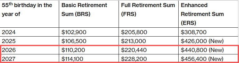 从2025年起,ERS已提高至BRS的四倍。对于将在2026年年满55岁的新加坡公民,ERS设定为440800新元。