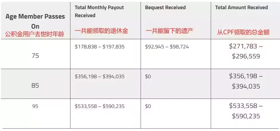从65岁起,退休人士每月可领到1478新币到1635新币。若在75岁去世,留下的CPF遗产为94,945新币到98,724新币;若在81岁或更晚去世,将不会留下遗产。