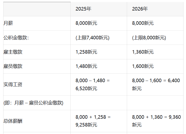 以一名在2026年年龄在55岁及以下、月收入8000新元的员工为例,2026年新政落实后的变化如下: