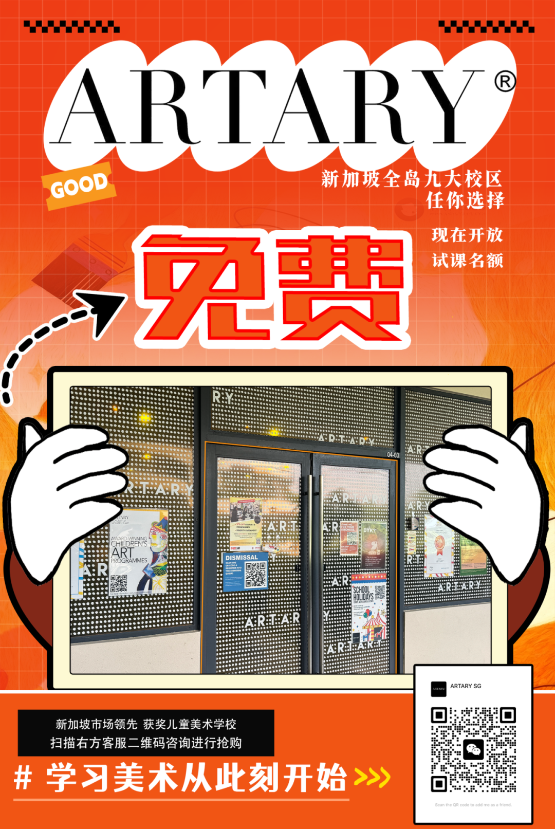 还在为娃找不到靠谱美术班焦虑?想借艺术天赋助力升学却无头绪?新加坡 ARTARY 儿童艺术学院来帮你!全岛 9 校区,开放 3 岁半至 12 岁免费试课名额,圆孩子艺术梦,还能为升学 DSA/SOTA 提前铺路。