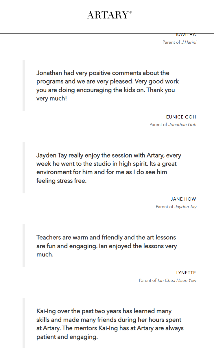 ARTARY是新加坡家长圈的 “宝藏美术校”,拿奖无数,2022/23 年包揽《Young Parents》“最佳课外教育学校”、《ParentsWorld》教育奖,还获新加坡总统志愿服务与慈善奖特别版认可。