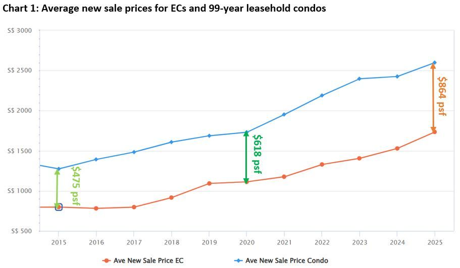 总的来说,EC因提供更可负担的私宅购置途径而受买家欢迎。其新销售均价不仅持续低于共管公寓,且价差自2015年以来显著扩大。