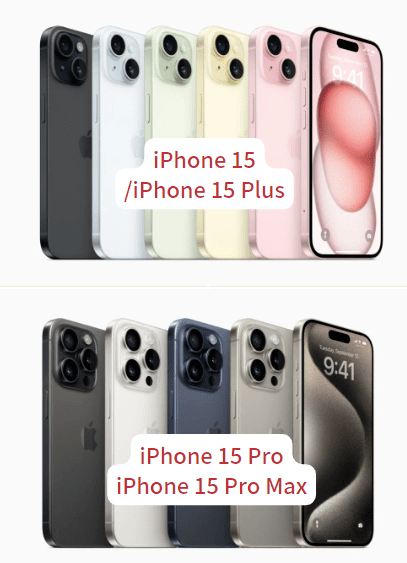 其中iPhone 15、iPhone 15 Plus机型和颜色一致,iPhone 15 Pro和iPhone 15 Pro Max机型和颜色一致。