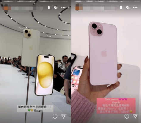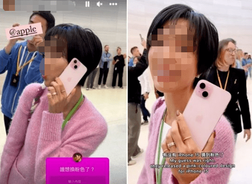 只见博主手拿iPhone 15粉色新机,还说着“这是有史以来最时髦和高级的iPhone了!”↓