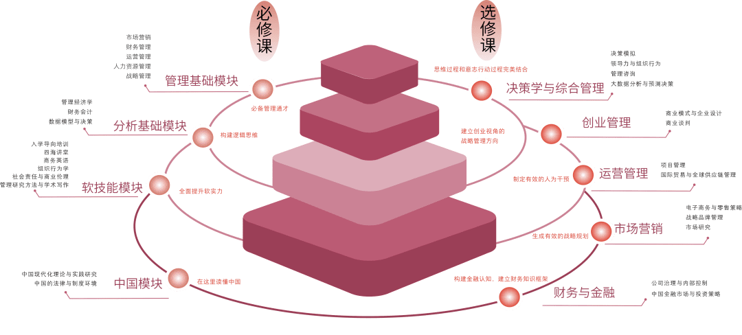 分为“管理基础模块”、“分析基础模块”、“软技能模块”与“中国模块”四个部分,帮助学生从四个主要维度,奠定坚实的工商管理知识、理论与技能基础。