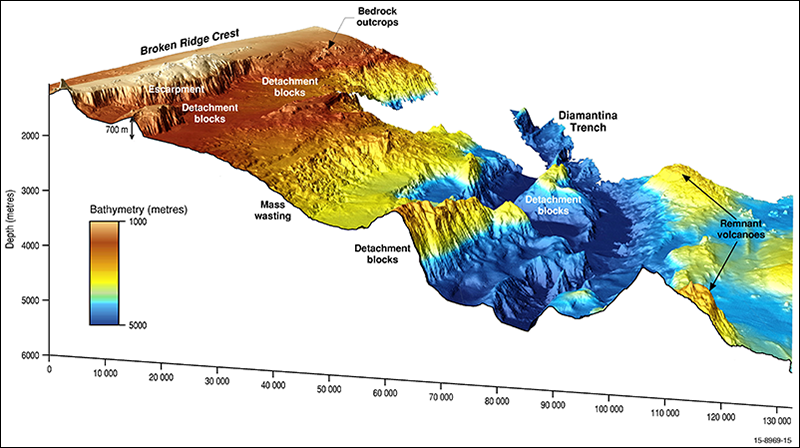 这是海底断脊的底部,一个充满峡谷跟水下火山的海洋高原。