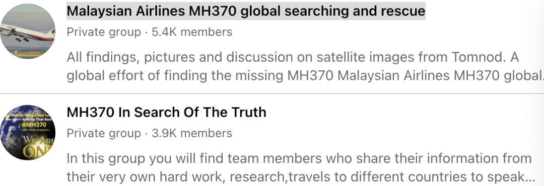 一直到今天,脸书上都还有专门的群组,大家一起讨论MH370搜寻、事故原因。↓