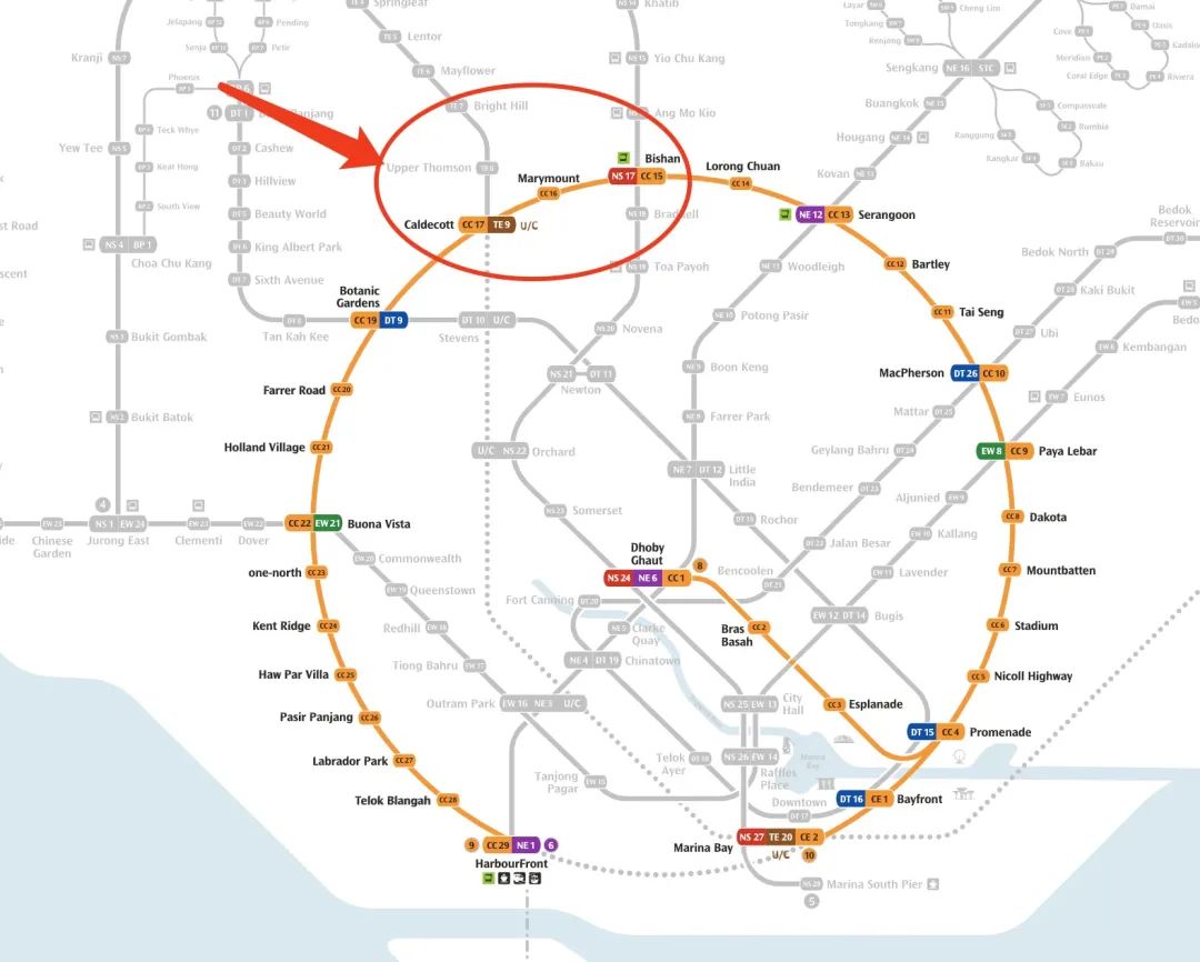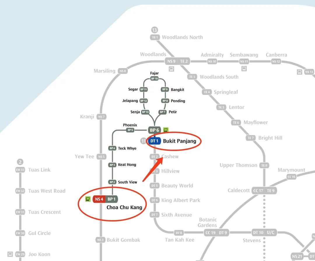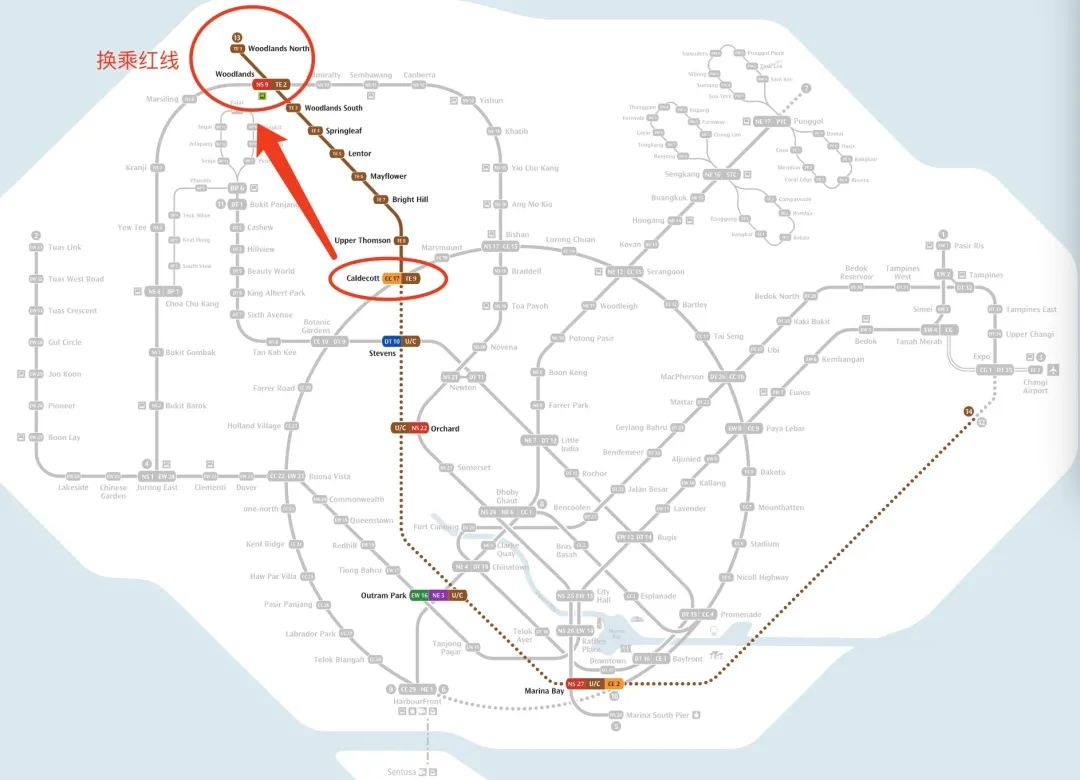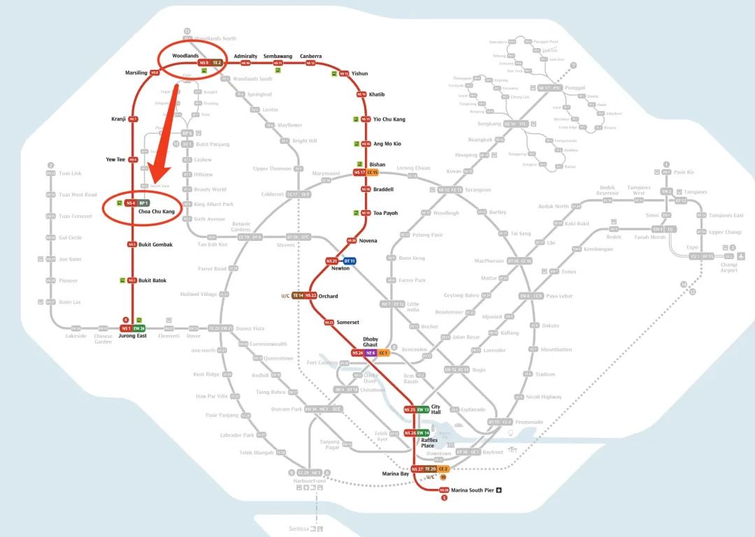 地铁站:兀兰北(Woodlands North)-蔡厝港( Choa Chu Kang),5站
