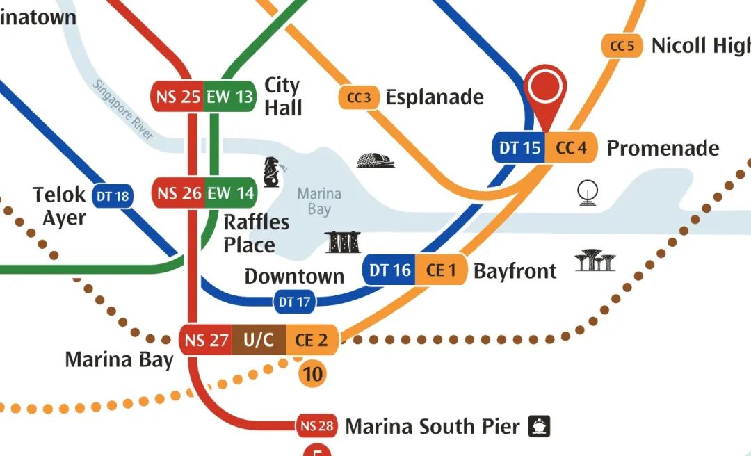 地铁站:滨海湾-多美歌(Dhoby Ghaut),5站