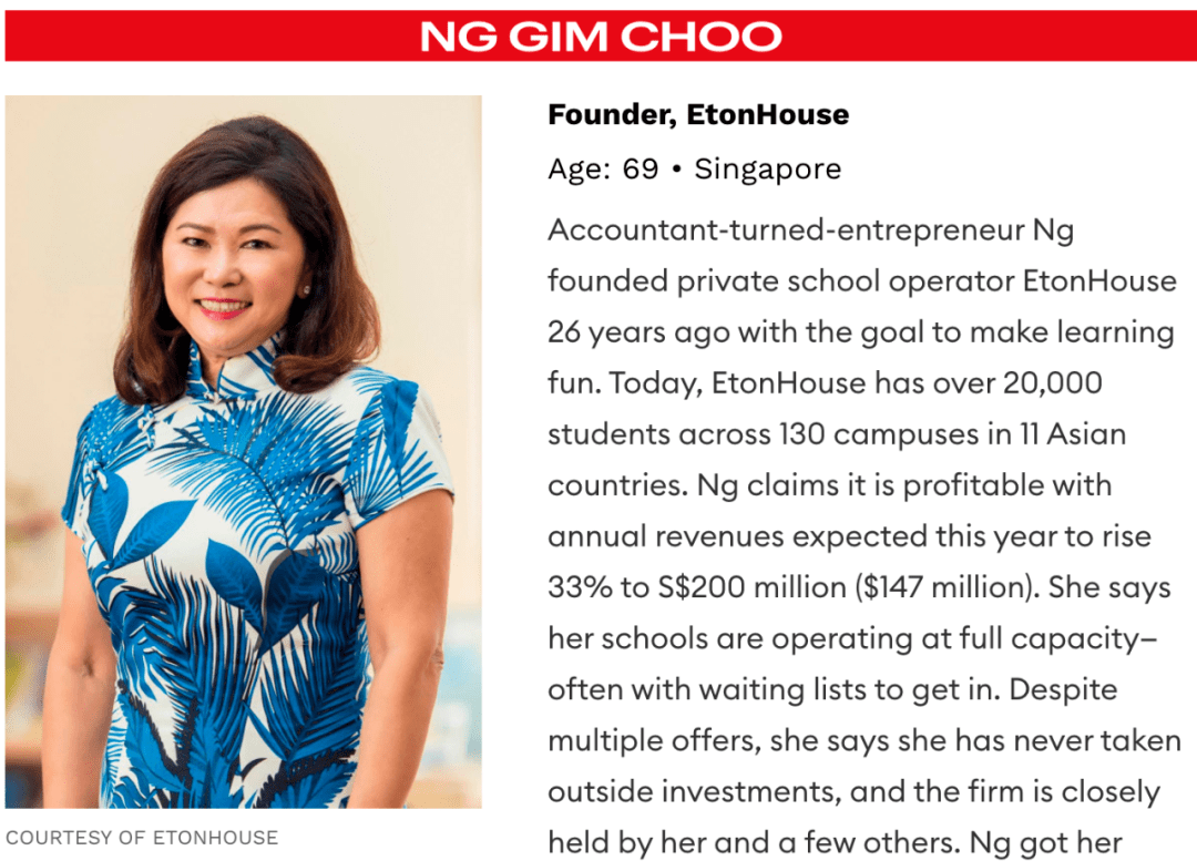现在,这个学校在全亚洲11个国家的130个校区里有着两万余名学生就读。今年该学校的收入约为两亿新币。
