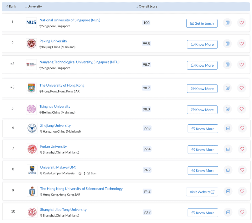 QS2022亚洲大学最新排名出来了!猜猜看新加坡国立大学和南洋理工大学排名为多少呢~