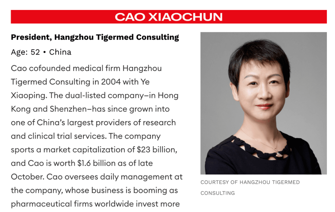 中国大陆也有一名女强人上榜,她是52岁的泰格医药联合创始人、执行董事、总裁曹晓春。