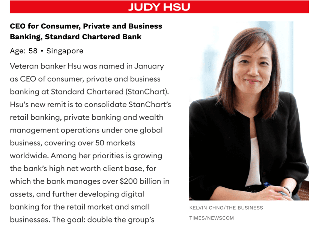 她们分别为:58岁的渣打银行消费者和私人及中小企业银行部门总裁徐仲薇、69岁的伊顿国际教育集团(EtonHouse)创始人胡锦珠和60岁的华侨银行集团行政总裁黄碧娟。